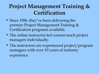 The document describes Project Management Training & Certification programs offered by 4PM.com that teach project management skills through online instructor-led courses. The courses involve reading, lectures, and applying techniques to real project situations with feedback from experienced instructor. Students work directly with instructors, receiving individual coaching, answers to questions, and written feedback on assignments to support their entire career in project management.