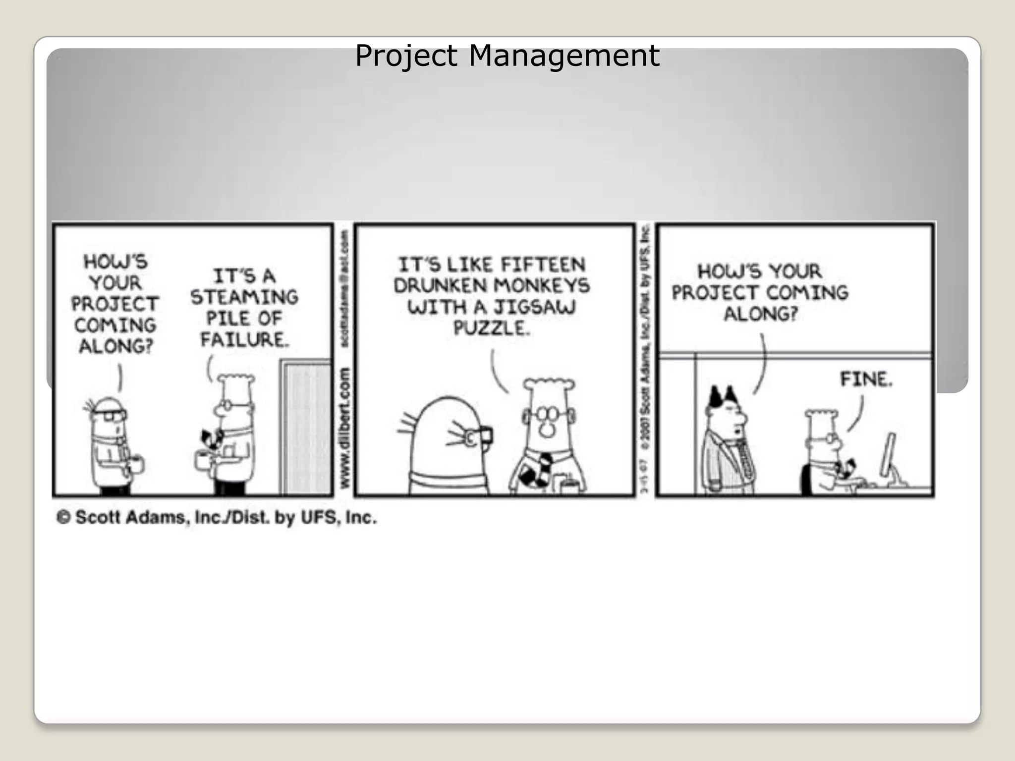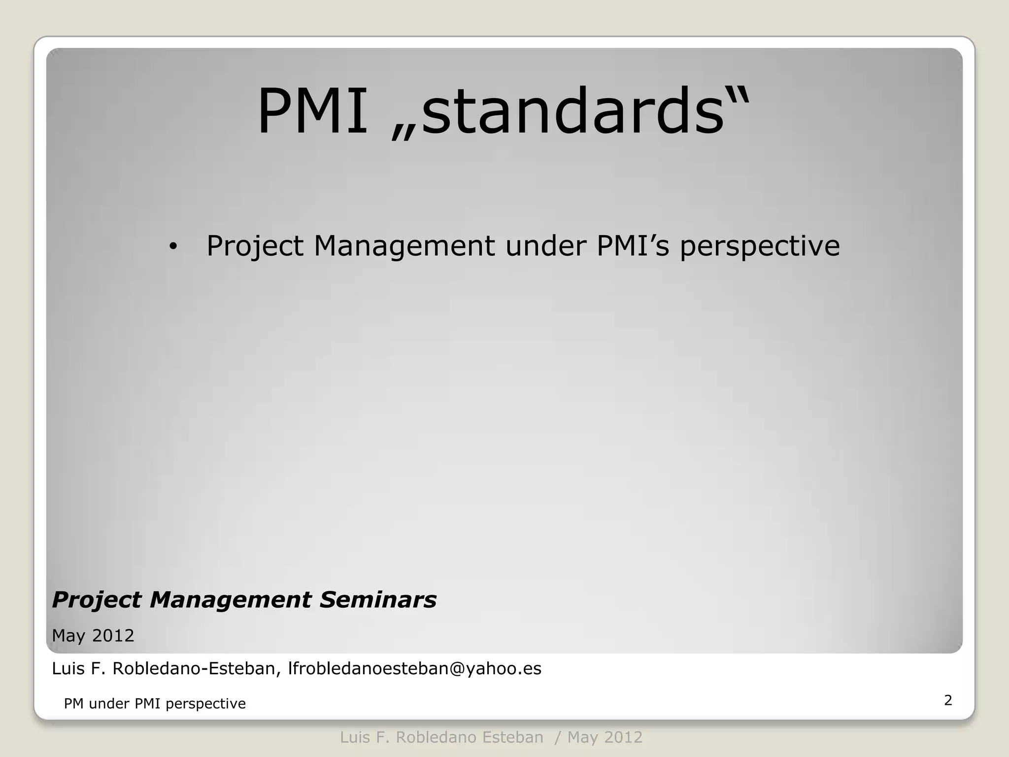 This document provides an overview of project management according to the Project Management Institute (PMI). It discusses key PMI concepts like the five process groups (initiating, planning, executing, monitoring and controlling, and closing), the project management lifecycle, and the nine knowledge areas. The presentation aims to establish a common understanding of PMI best practices and terminology among project managers and stakeholders.
