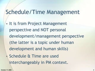 This document discusses project schedule management from a project management perspective, emphasizing the importance of time, scope, and cost as part of the triple constraint. It outlines the processes involved in schedule planning, development, optimization, and control, including key concepts like critical path and schedule baselining. Additionally, it highlights the dangers of deviating from the schedule and the necessity for planned changes.