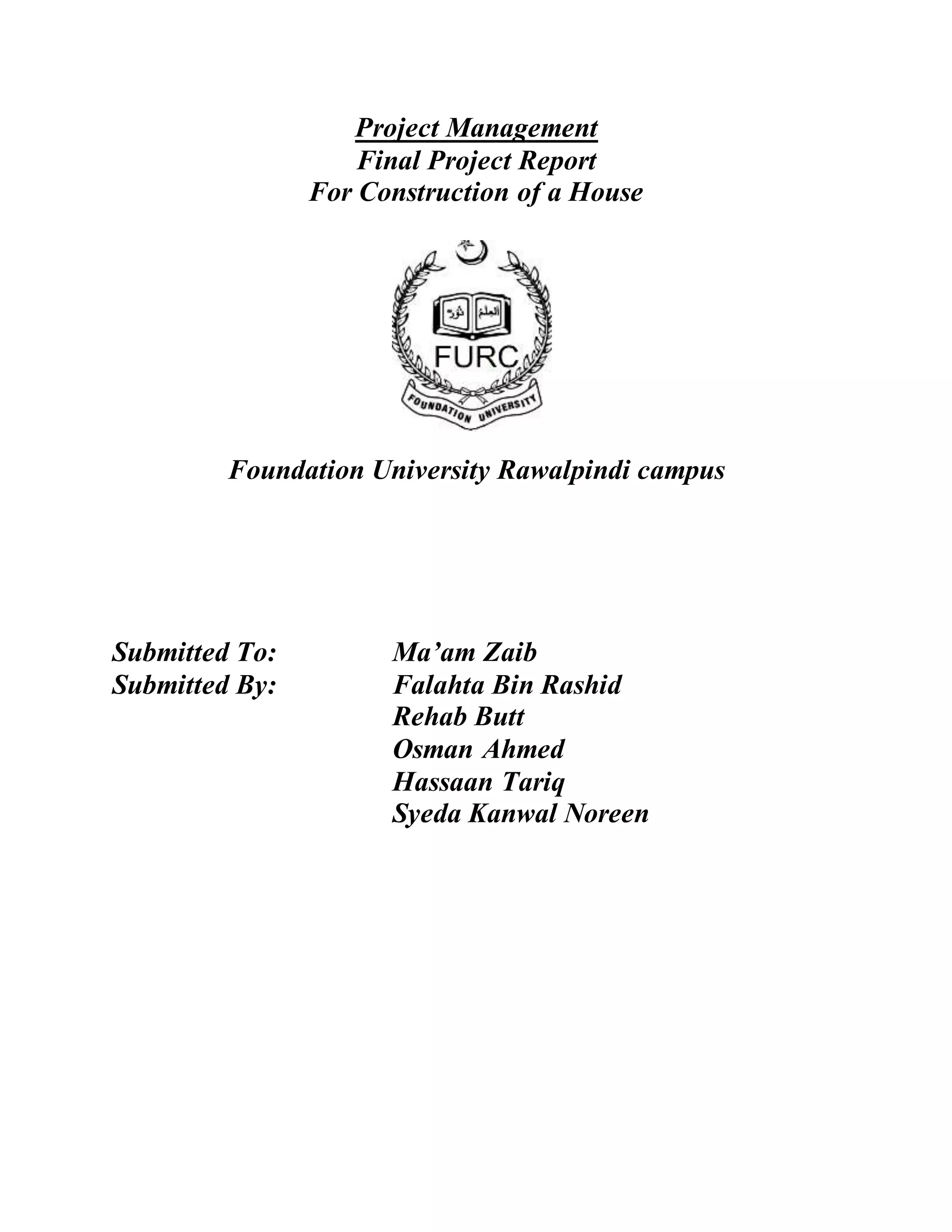 This document provides a project management plan for constructing a house. The project has a budget of 1.59 crores and timeline of 1 year. Key aspects of the plan include stakeholder analysis, a project charter outlining goals and objectives, a work breakdown structure, and plans for scope, schedule, cost, risk, and communication management. The plan aims to complete construction within budget and timeline through effective management of the triple constraints of scope, time, and cost.