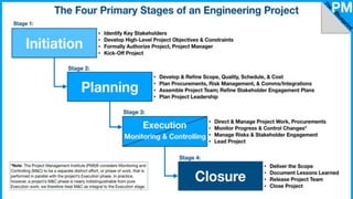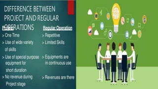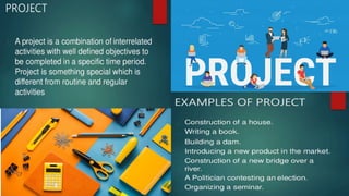 Project management involves coordinating teams and resources to achieve project goals within constraints like time and budget. It requires defining project requirements, planning the work, executing the plan, and closing out the project upon completion. The project manager leads the team through distinct phases from initiation to planning, execution, and closing. Effective project management requires coordinating cross-functional teams using standardized methodologies to deliver a unique product or service that meets the customer's needs.