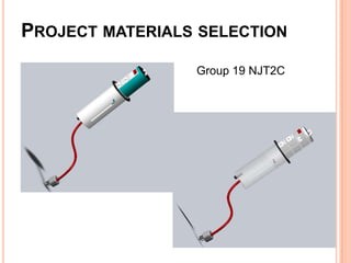 This document discusses the material selection process for a group project to design a universal electrical outlet. It begins by outlining the product requirements, including its intended function of supporting 6 sockets and sliding in/out of a table, costing less than 200 baht, and having a modern appearance. Next, it examines the interacting components and manufacturing process. It then evaluates the performance requirements and suitable materials based on charts of material properties. Several plastic materials are considered based on their mechanical, electrical and thermal properties as well as cost. Finally, the document discusses suitable manufacturing processes and estimates the per-unit manufacturing cost.