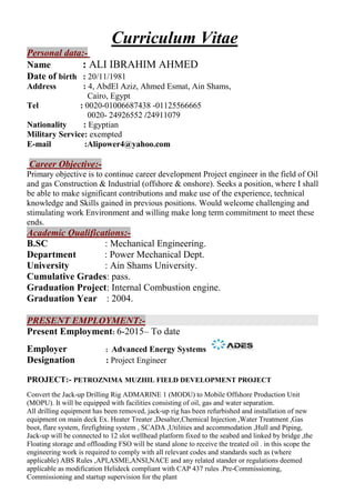 Ali Ibrahim Ahmed is seeking a position as a Project Engineer in oil and gas where he can make use of his experience. He has a Bachelor's degree in Mechanical Engineering from Ain Shams University. His current role is as a Project Engineer at Advanced Energy Systems since 2015 where he is working on converting an offshore drilling rig into a production unit. Previously he has over 10 years of experience in engineering roles for oil and gas construction projects.