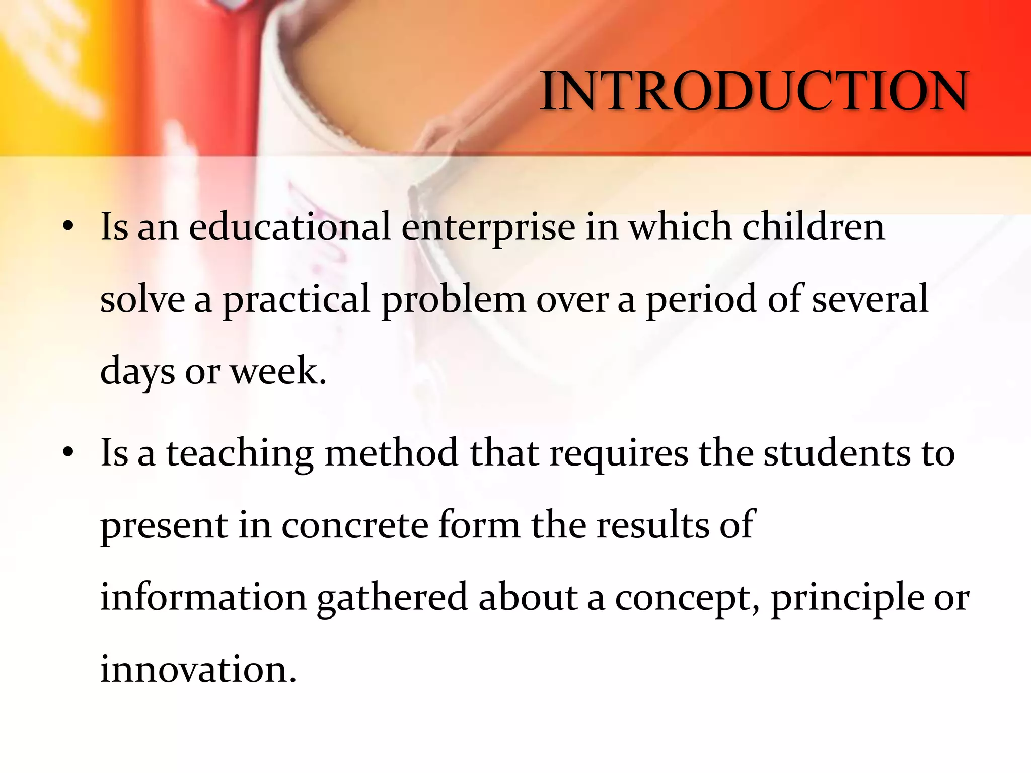 The document discusses the project method of teaching and learning. It defines a project as a whole-hearted activity carried out by students to completion. Key characteristics of a project include being problematic, aimed at a goal, purposeful, practical, and student-directed. Principles of the method are that it motivates students through purpose and activity, and draws on experience and social learning. Projects can be individual or group-based. Steps involve creating a situation, selecting a problem, planning, executing, evaluating, and reporting. Benefits are that it arouses interest and develops skills, while disadvantages include the time required and limited topics that can be covered.