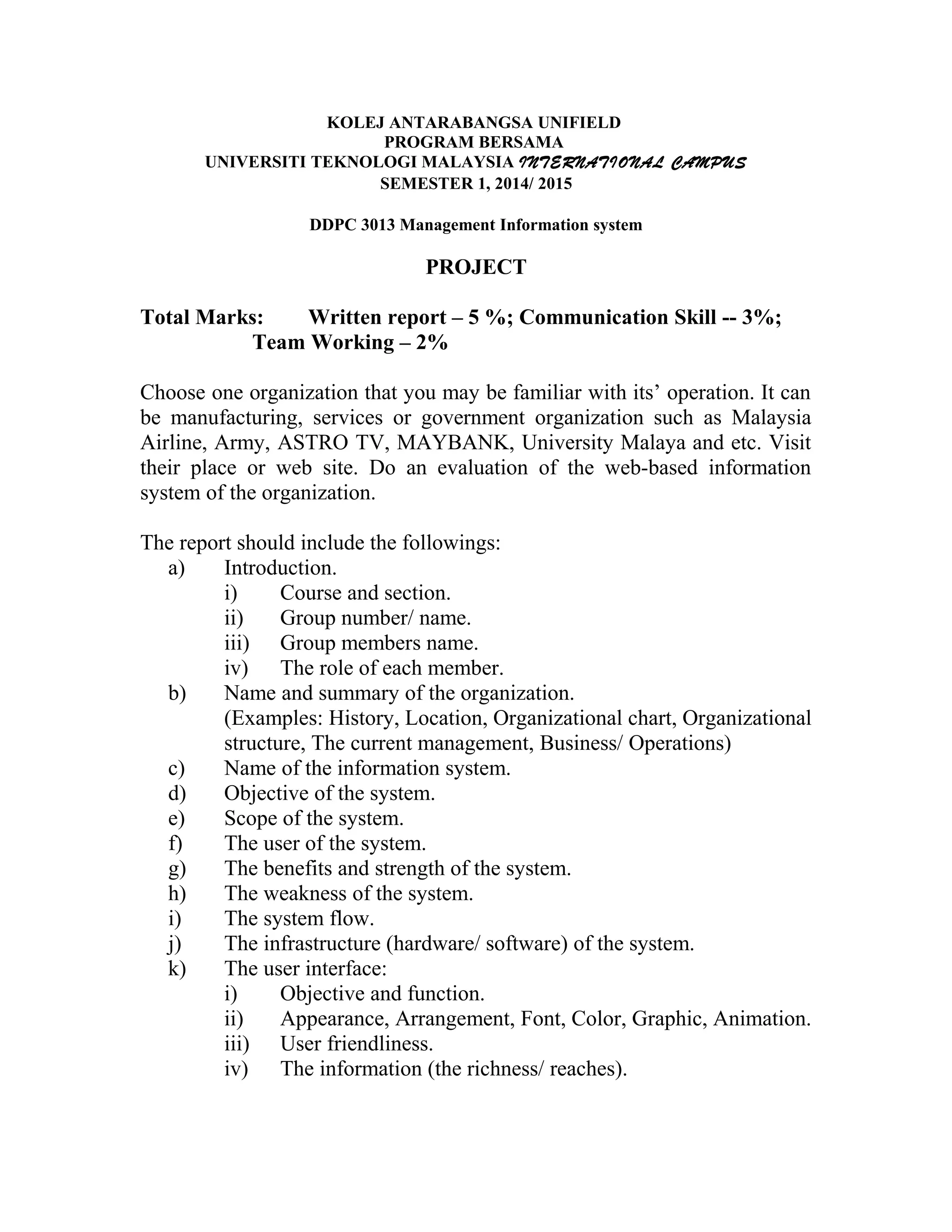 This document outlines the requirements for a group project evaluating the information system of an organization. Students must choose an organization they are familiar with, visit its website, and evaluate the web-based information system. The report should include an introduction, summary of the organization, description of the information system, analysis of the system's objectives, users, benefits, weaknesses, infrastructure, user interface, how it supports business strategies, effectiveness, and recommendations for improvement. The report must follow specific formatting guidelines and include attachments of relevant web pages. The project aims to develop students' skills in evaluating information systems and communicating findings.