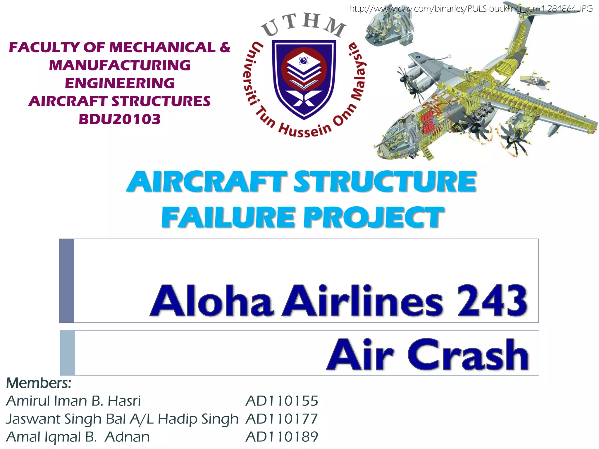 This document discusses an aircraft structures failure project analyzing the 1988 Aloha Airlines Flight 243 accident. It provides an overview of the accident, describing how part of the Boeing 737's fuselage tore apart in flight. It then summarizes the finite element analysis conducted using ANSYS software to simulate stresses on the aircraft structure. Images and references are included at the end.