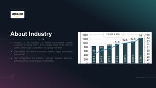 Amazon is the leading online retailer in the US with a 23% market share. It was founded in 1994 and is headquartered in Seattle. Amazon targets all demographics and offers a wide range of products with convenient online purchasing and competitive prices. It has successfully positioned itself as a global e-commerce company that allows customers to buy anything and have it delivered anywhere.