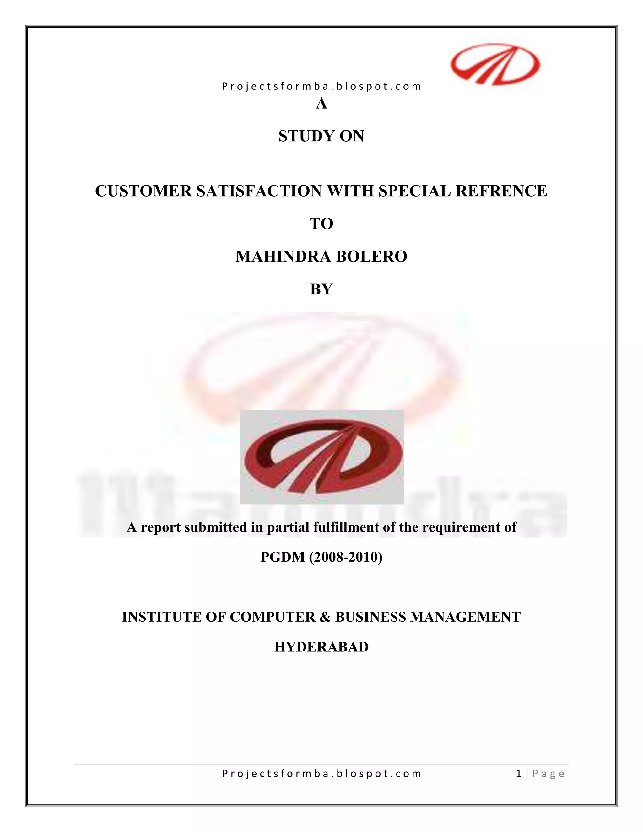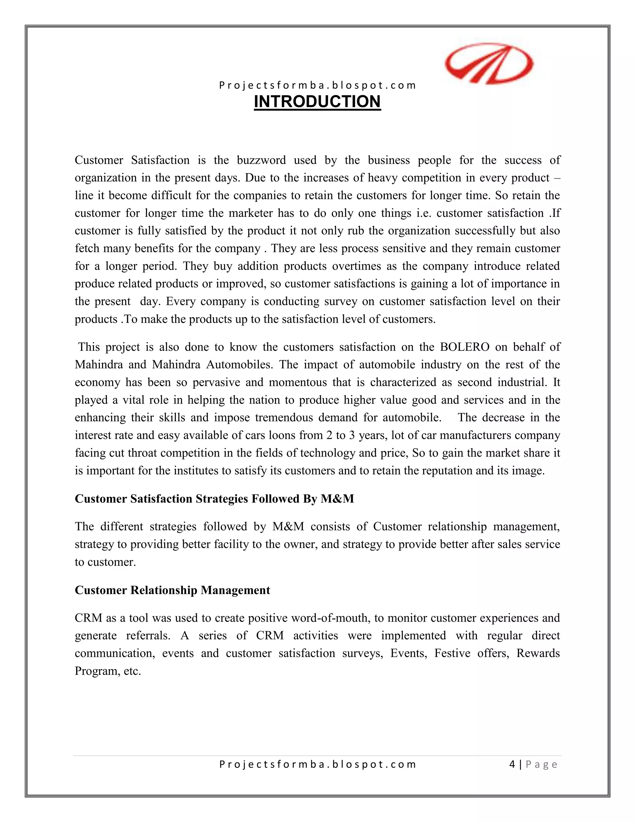 The document provides an overview of the Indian automobile industry and Mahindra & Mahindra's (M&M) operations. It discusses M&M's history and product portfolio, which includes utility vehicles, tractors, and military vehicles. The document also describes strategies used by M&M to improve customer satisfaction, including customer relationship management programs. Primary and secondary research was conducted to analyze customer satisfaction with M&M's Bolero SUV in the city of Allahabad.