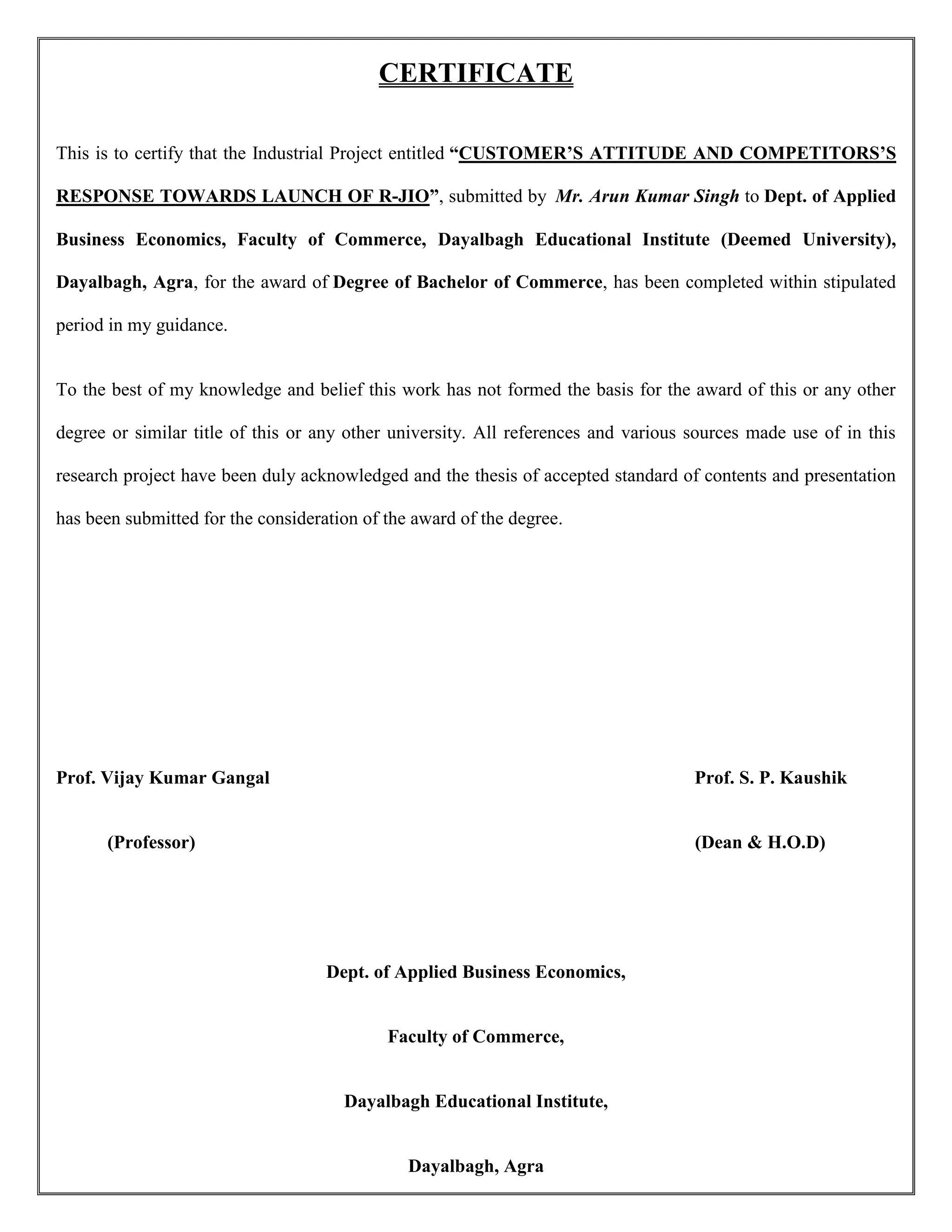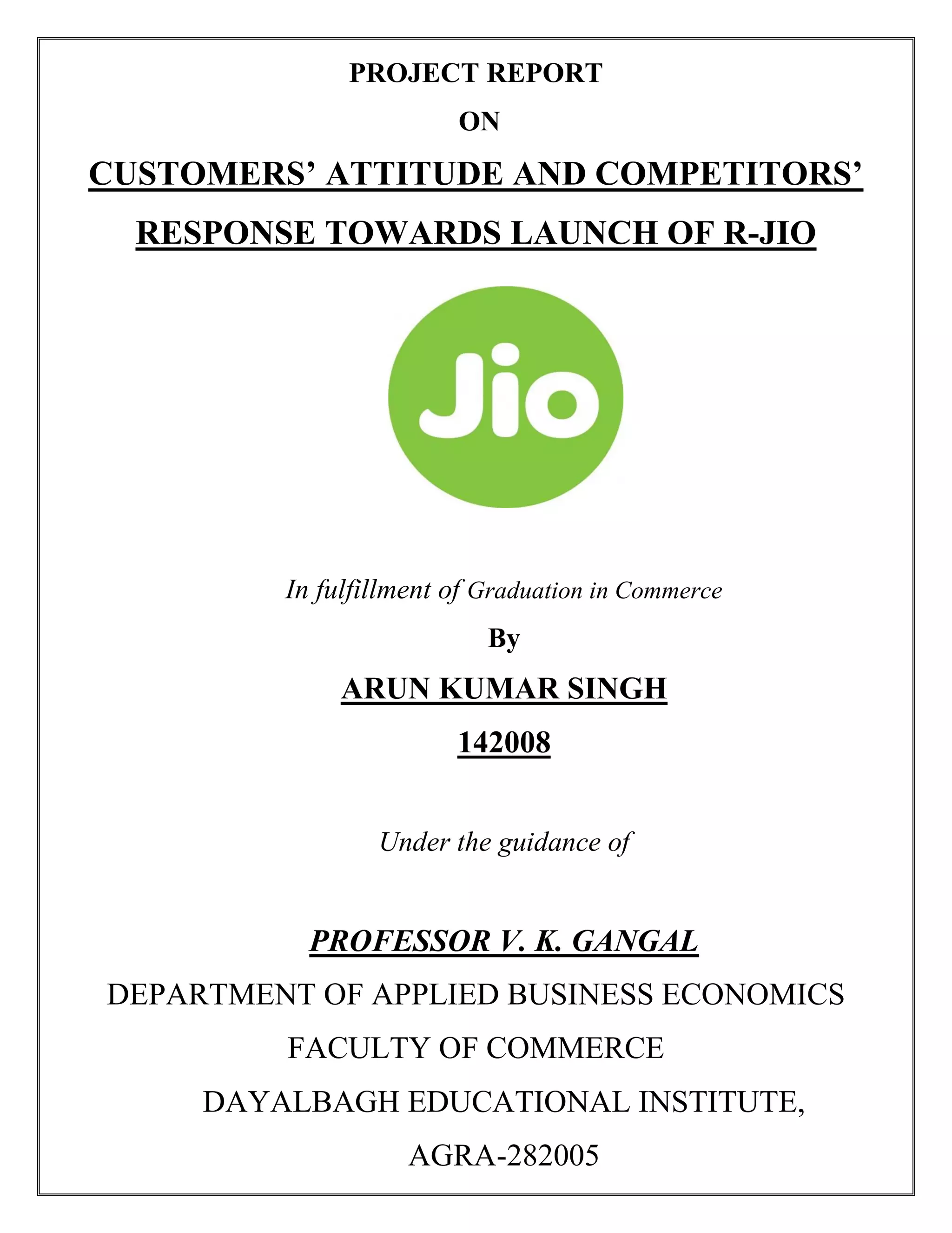 This project report analyzes customers' attitudes and competitors' responses to the launch of Reliance Jio in the Indian telecommunications sector. It highlights the rapid growth of the sector due to government reforms, consumer demand, and the emergence of Jio's competitive pricing model. The report includes various chapters on industry statistics, research methodology, findings, and consumer surveys to draw conclusions on market dynamics.