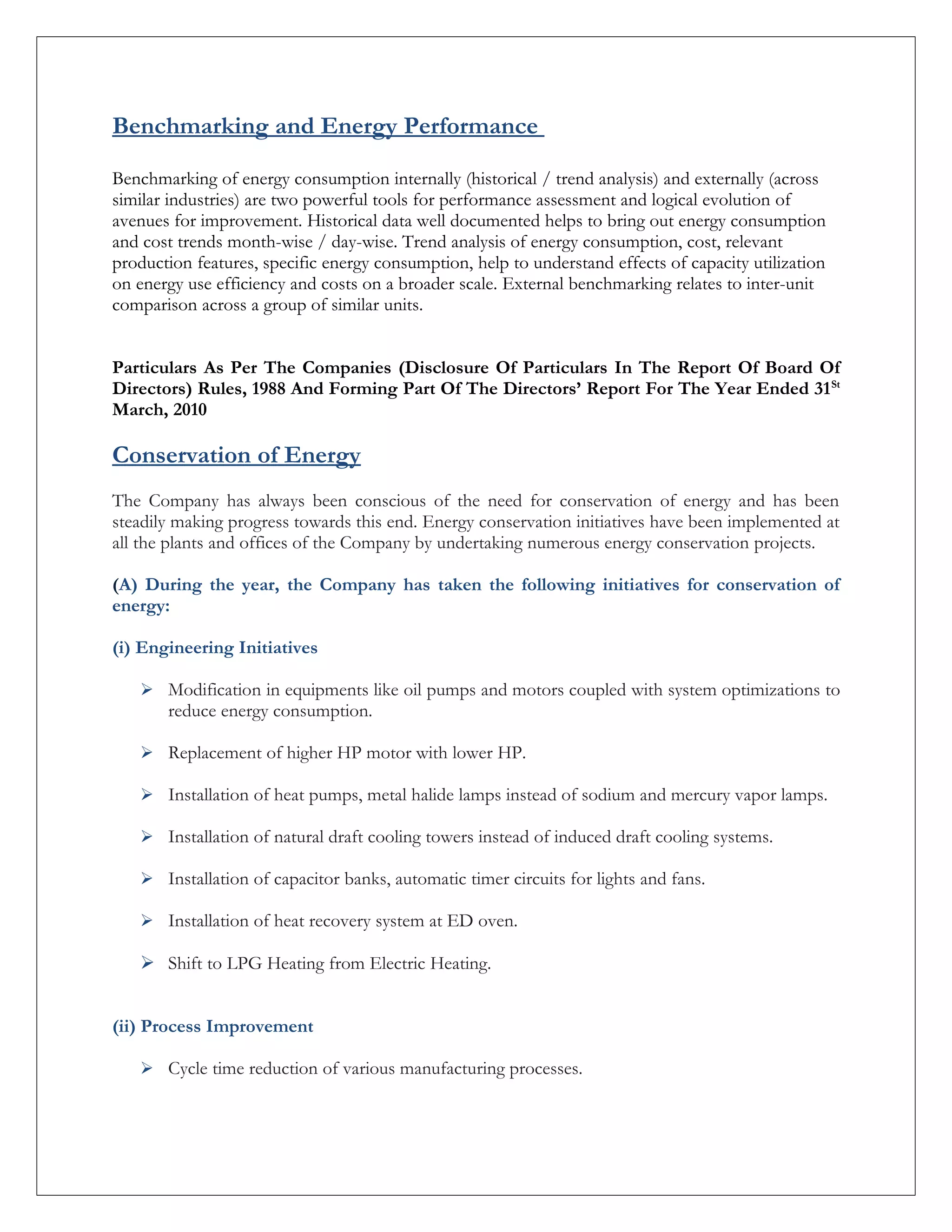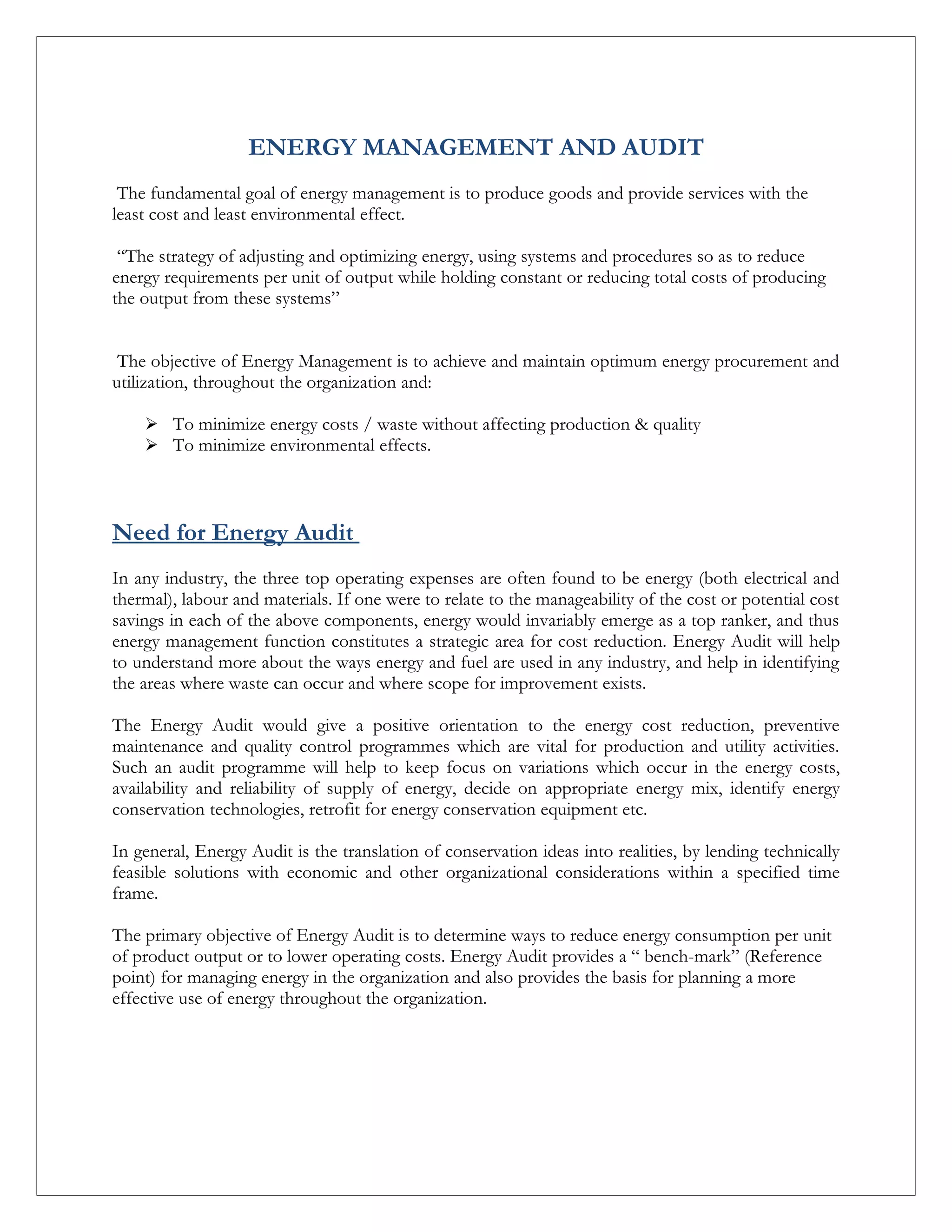 The document discusses energy management and audits. It explains that the goal of energy management is to produce goods and services with the least cost and environmental impact. An energy audit helps identify areas of waste and inefficiency to reduce energy costs without affecting production. Benchmarking energy usage internally and comparing to similar industries allows for assessing performance and finding improvement opportunities. The document then provides details on a company's energy conservation initiatives through engineering changes, process improvements, and awareness programs that have reduced energy consumption and costs.