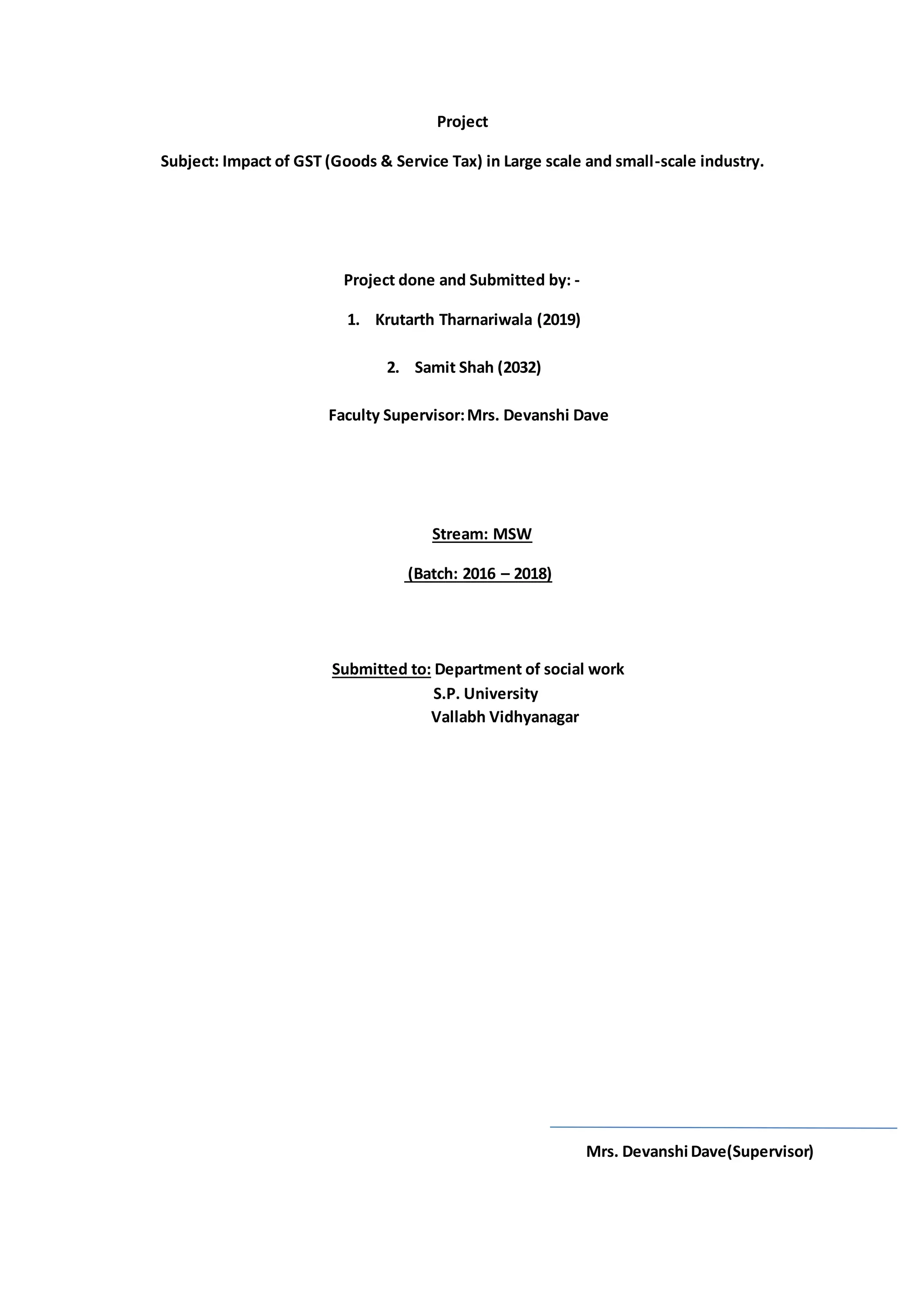 This document summarizes a student project on the impact of the Goods and Services Tax (GST) in India on large and small-scale industries. The project was completed by two students and submitted to their faculty supervisor in the Department of Social Work. The document includes an index and discusses topics like the taxes merging into GST, how dual GST will work, tax credits, billing systems after GST, registration structures, and return filing requirements for different business types.