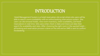 This document summarizes a project on developing a hotel management system. The system will allow online booking of hotel rooms where users can search for availability, view room details, and book reservations in real-time. It aims to reduce paperwork, improve efficiency, ensure data security and accuracy when making reservations. The system requires software like PHP, HTML, and CSS along with hardware including Windows OS, at least 1GB RAM and 5GB hard disk space. It will provide a flowchart and allow customers to easily view room availability and details instead of searching around.
