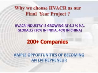 The document discusses refrigeration and air conditioning systems. It provides information on various types of cooling systems including vapor-compression cycles used in refrigerators and air conditioners. It also discusses different refrigerants commonly used and covers the design and components of domestic, commercial, and transport refrigeration and air conditioning systems.