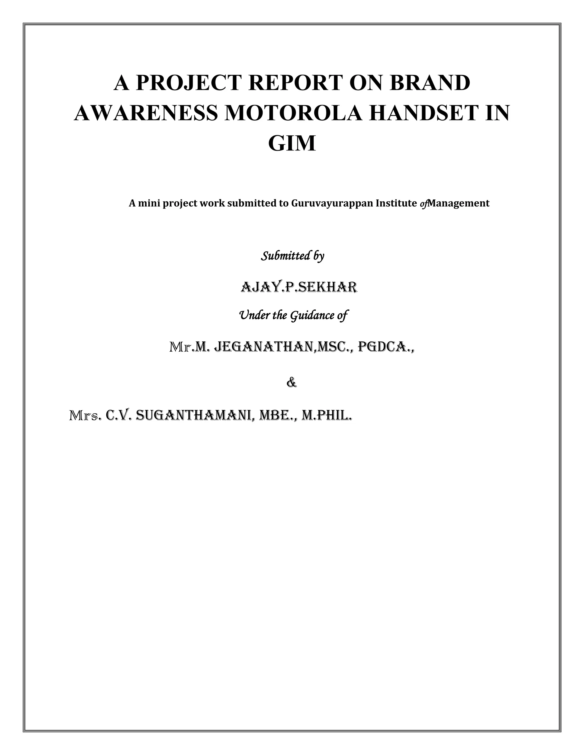 1) The document is a project report on brand awareness of Motorola handsets among students at Guruvayurappan Institute of Management.