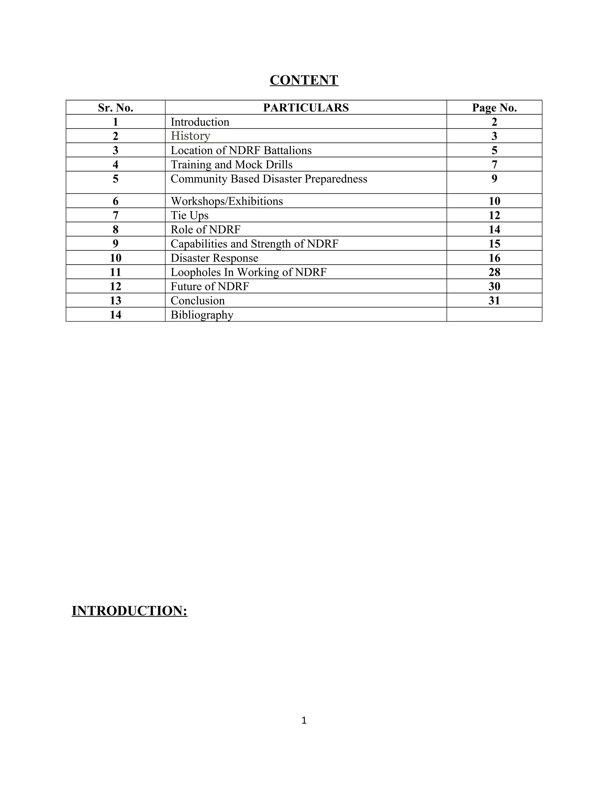 The document provides information about the National Disaster Response Force (NDRF) of India. It discusses the history, organization, training, capabilities, and major disaster response operations of the NDRF. The NDRF was established in 2006 and consists of 10 battalions located across India for rapid response. It is trained in search and rescue, medical response, and handling different types of disasters. The NDRF has responded to numerous floods, earthquakes, cyclones, and other disasters, rescuing over 135,000 people.