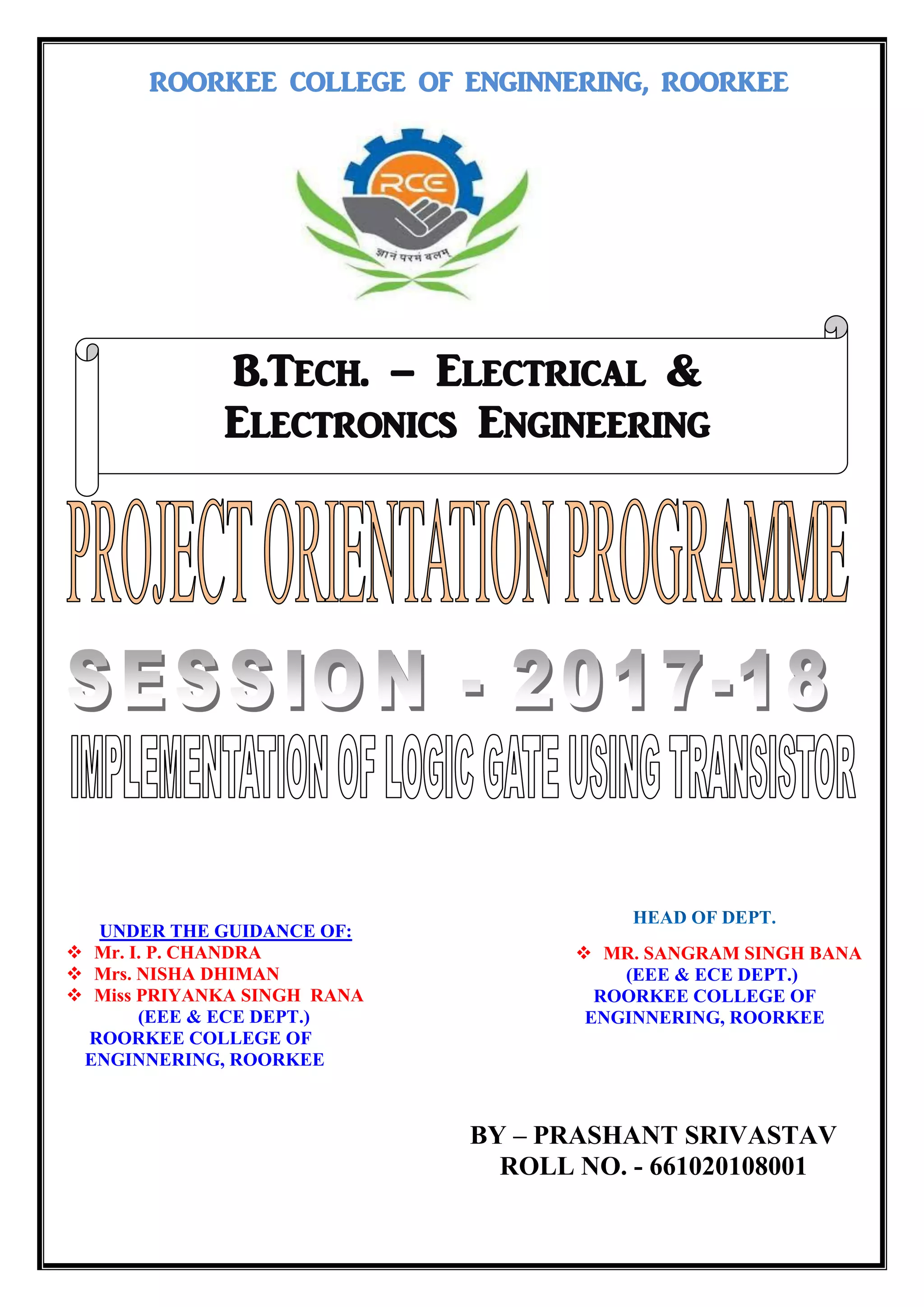 The document outlines a project on implementing a NAND gate using an NPN transistor, detailing the components required and the principles of digital logic gates. It discusses the significance of NAND gates in computing, including their application in biological logic gates developed by scientists, which mimic electronic logic gates using modified DNA and bacteria. Additionally, the document provides acknowledgments, an abstract, objectives, and bibliographic references related to the project.