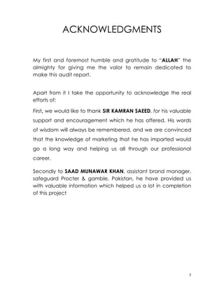 This document provides information about the marketing strategies of P&G Pakistan for its brand Safeguard soap. It discusses P&G's portfolio in Pakistan, a SWOT analysis of P&G, product profile of Safeguard soap, segmentation strategies, positioning, pricing, distribution, and advertising strategies. The document aims to provide high-level information about P&G's overall marketing approach and strategies for Safeguard soap.