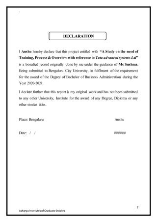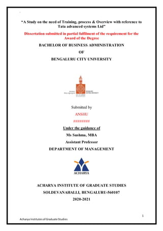 The document is a dissertation submitted by Anshu for the Bachelor of Business Administration degree, focusing on the need for training within Tata Advanced Systems Ltd. It outlines the importance of training and development in enhancing employee skills and productivity, detailing various types of training and processes involved in effective training programs. The study emphasizes the impact of well-structured training on employee morale, organizational success, and the overall business environment.