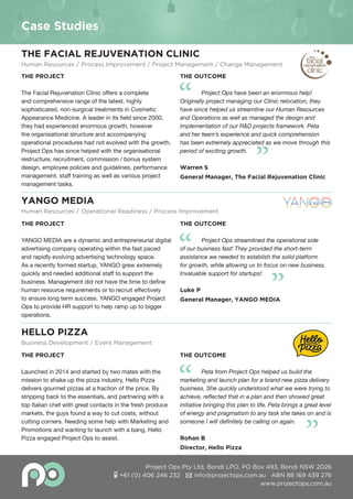Project Ops provides affordable business operations consultancy, coaching, and mentoring services to small businesses and startups, focusing on areas such as human resources, process improvement, project management, and business development. They assist companies undergoing growth or requiring operational readiness, while offering support across various tasks, including event management and change management. Through case studies, Client testimonials reveal how Project Ops effectively streamlined operations, aided in staff recruitment, and facilitated successful business initiatives.