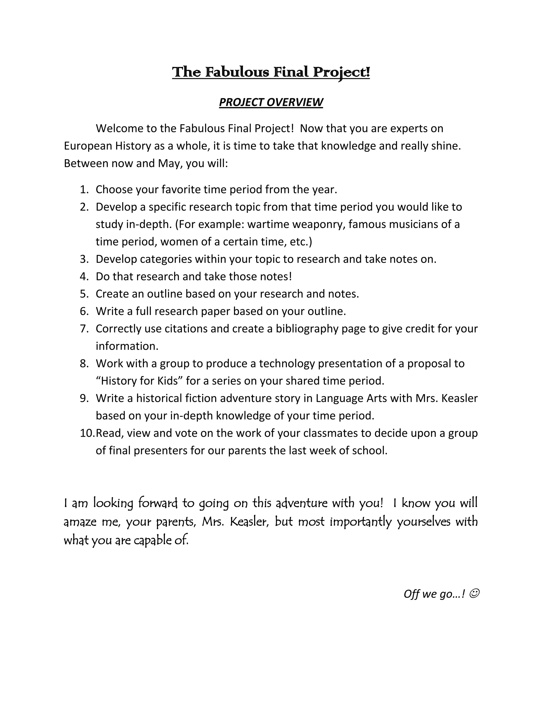 The document provides an overview of the Fabulous Final Project assigned to students. Students will choose a time period from European History to research in depth. They will develop categories to focus their research and take notes. Students will then write a research paper on their topic with citations and a bibliography. They will also create a technology presentation with a group and write a historical fiction story based on their time period. Finally, students will review classmates' work and select final presenters for parents at the end of the school year.