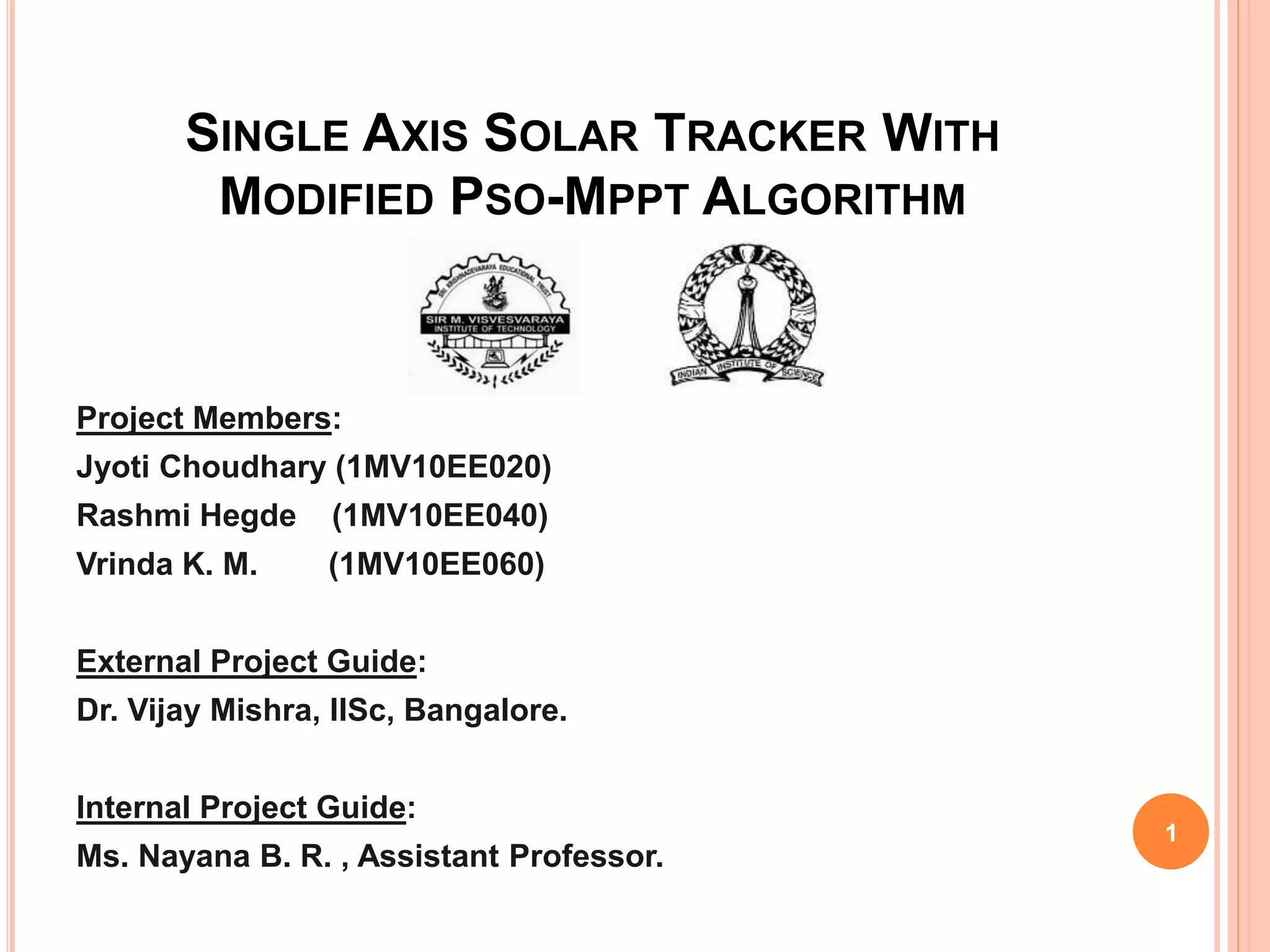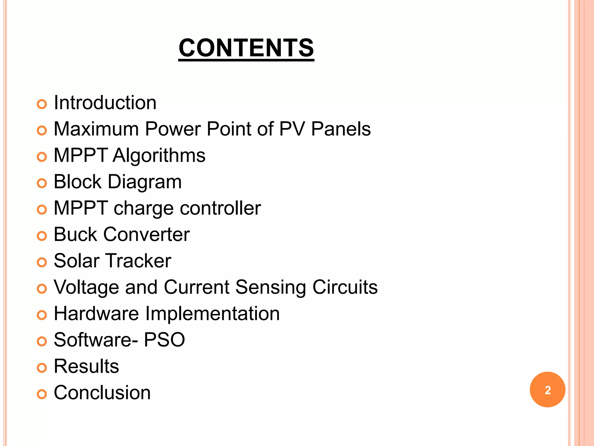 This document describes a student project to build a single axis solar tracker using a modified particle swarm optimization maximum power point tracking (PSO-MPPT) algorithm. It includes sections on maximum power point of PV panels, different MPPT algorithms including PSO, the block diagram, charge controller, buck converter, solar tracker, voltage/current sensing circuits, hardware implementation, the PSO software, and test results. The results show the solar tracker effectively tracked the sun and the PSO-MPPT algorithm found the maximum power point under different lighting conditions including partial shading. The hardware implementation matched the performance in the reference paper on PSO-based MPPT.