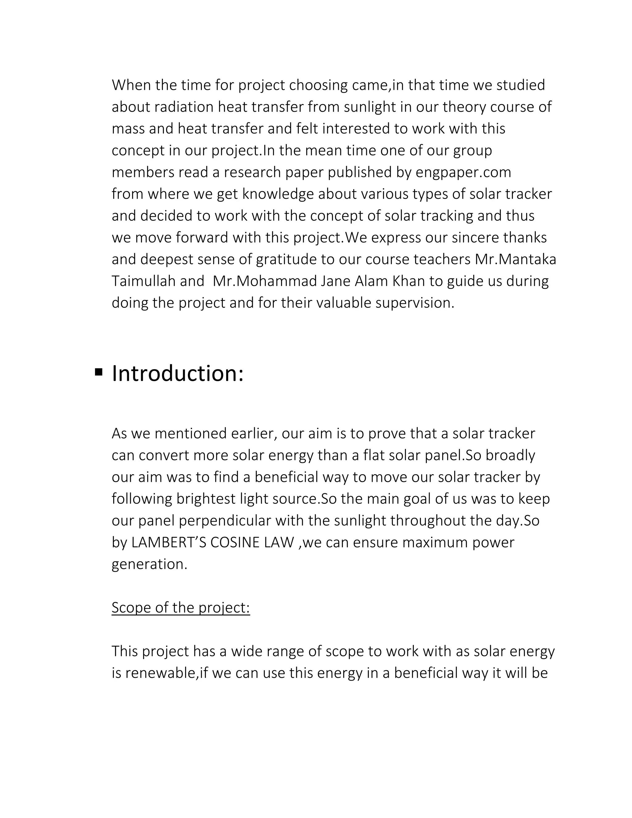 The document summarizes a student project that designed and built a dual-axis solar tracker and compared its energy production to a flat solar panel using power meters. The solar tracker used an Arduino microcontroller and four light sensors to control two servo motors and keep the solar panel perpendicular to the sun throughout the day, following the principle of Lambert's cosine law to maximize power generation. Testing found the solar tracker produced more energy than the flat panel over a three hour period, showing the benefits of solar tracking for electricity production. The project provided an introduction to solar energy technology and its wide range of applications.