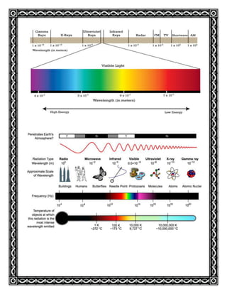 1. Electromagnetic radiation consists of synchronized oscillations of electric and magnetic fields that travel through space as waves. It includes radio waves, microwaves, infrared, visible light, ultraviolet, X-rays and gamma rays.