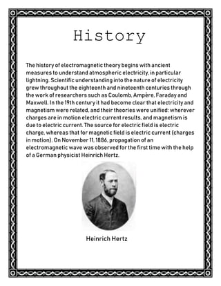 2. The history of electromagnetic theory began with studies of lightning and progressed through the work of scientists like Coulomb, Ampère, Faraday and Maxwell. Maxwell unified electric and magnetic field theories and predicted electromagnetic waves.