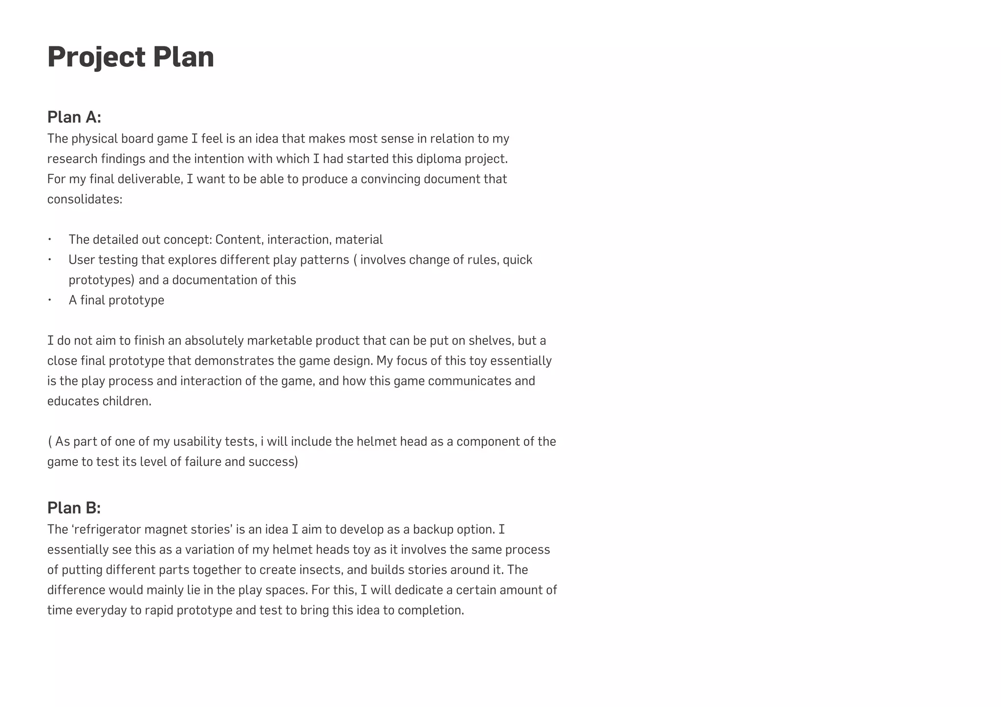 This document outlines two project plans - Plan A and Plan B - for creating an educational board game or toy. Plan A involves developing a physical board game with detailed concepts, user testing of prototypes to explore play patterns and rules, and a final prototype. The focus is on the play process and how it teaches children. Plan B is a backup idea of 'refrigerator magnet stories' that similarly involves assembling parts but with a different play space. A timeline is then provided laying out the project schedule from early September to mid-October, including concept development, prototyping, testing, refinement, and documentation.