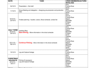The document outlines the production timeline and tasks for a film project. It assigns crew members and actors to complete tasks such as drafting a presentation, finalizing planning details, filming, and logging footage from April to January. Key dates include presenting a first draft in April, finalizing planning from October 18th to 22nd, starting filming from October 25th to 29th, continuing filming from November 3rd to December 8th, and logging footage on December 15th and from December 20th to January 4th.