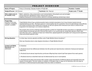 The project aims to create a genetic profile of the diverse student population at Virgil Middle School over 3 weeks to highlight common traits and promote unity despite diversity using surveys, research, and Punnett squares to predict traits; it will address genetics standards and teach collaboration, critical thinking, and presentation skills through a survey, posters, and presentations showing how genetics can demonstrate unity in the school.