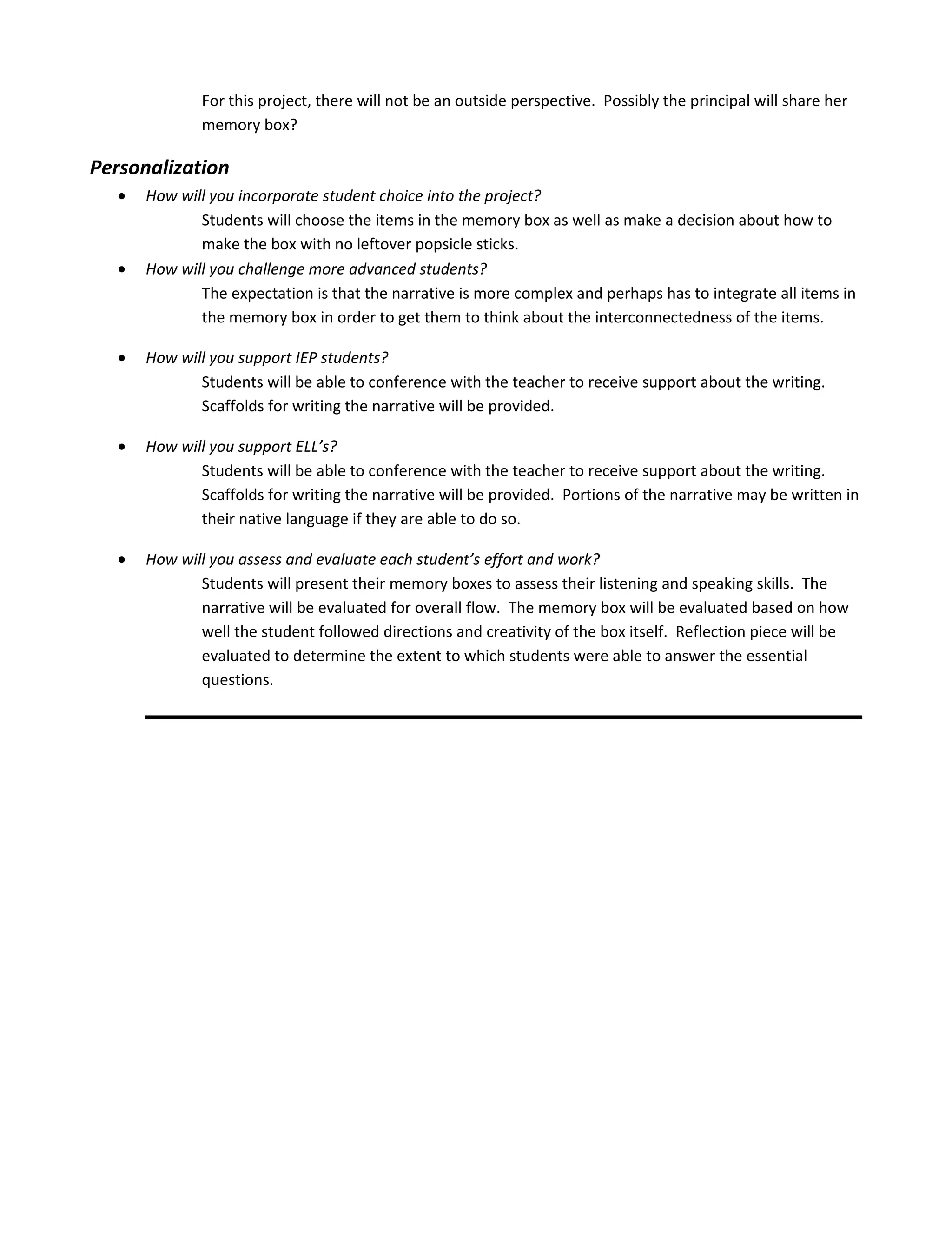 Students will create a memory box out of popsicle sticks containing personal items. They will write a narrative tying one item to a memory. Essential questions focus on how memories relate to kept objects and what they say about identity. Students present boxes and reflections are evaluated using a rubric. The project allows students to express identity and build community understanding.