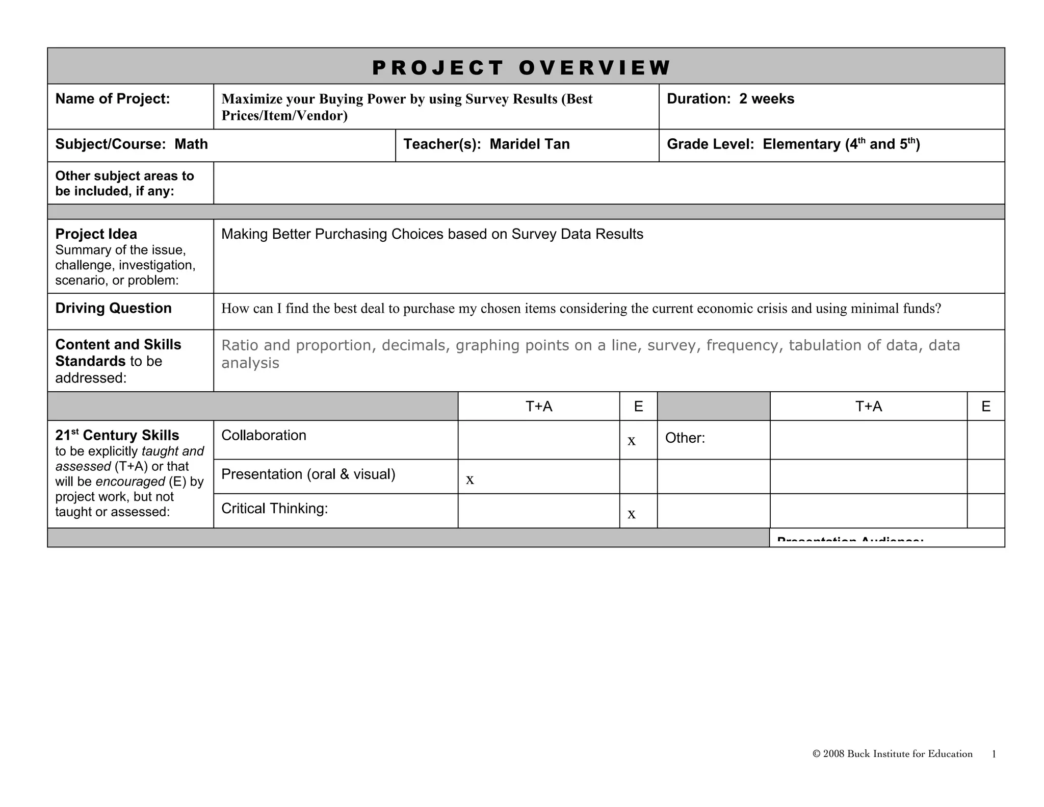 This 2-week math project involves students in 4th and 5th grade conducting a survey to find the best deals when purchasing various items. Students will determine favorite items across 5 categories and get price quotes from 5 vendors. They will then tabulate the survey results, use ratios and proportions to analyze the data, and graph their findings. Students will conclude which vendors offer the best prices. They will present their results orally and visually to their class and school community. The goal is for students to learn how to make more informed purchasing decisions considering economic factors.