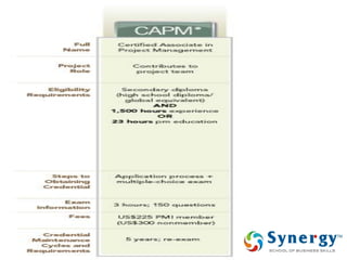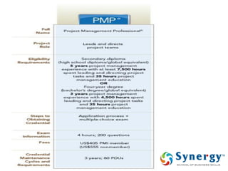 The document discusses project management concepts including the Project Management Institute (PMI), the Project Management Body of Knowledge (PMBOK), project lifecycles, and factors that influence project success and failure. It describes PMI as the body that developed best practices in project management and published the PMBOK guide. The PMBOK guide contains standard processes, tools, and techniques used in managing projects. Project management involves applying knowledge, skills, and techniques to meet requirements through activities like planning, executing, monitoring and controlling projects.