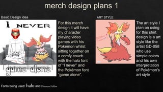 Mando is planning his first merch design featuring his character playing video games with Pokémon. The art style will be simple colors inspired by artist GD-058. Mando then provides details on the character designs for himself and Stephany the Braxin.