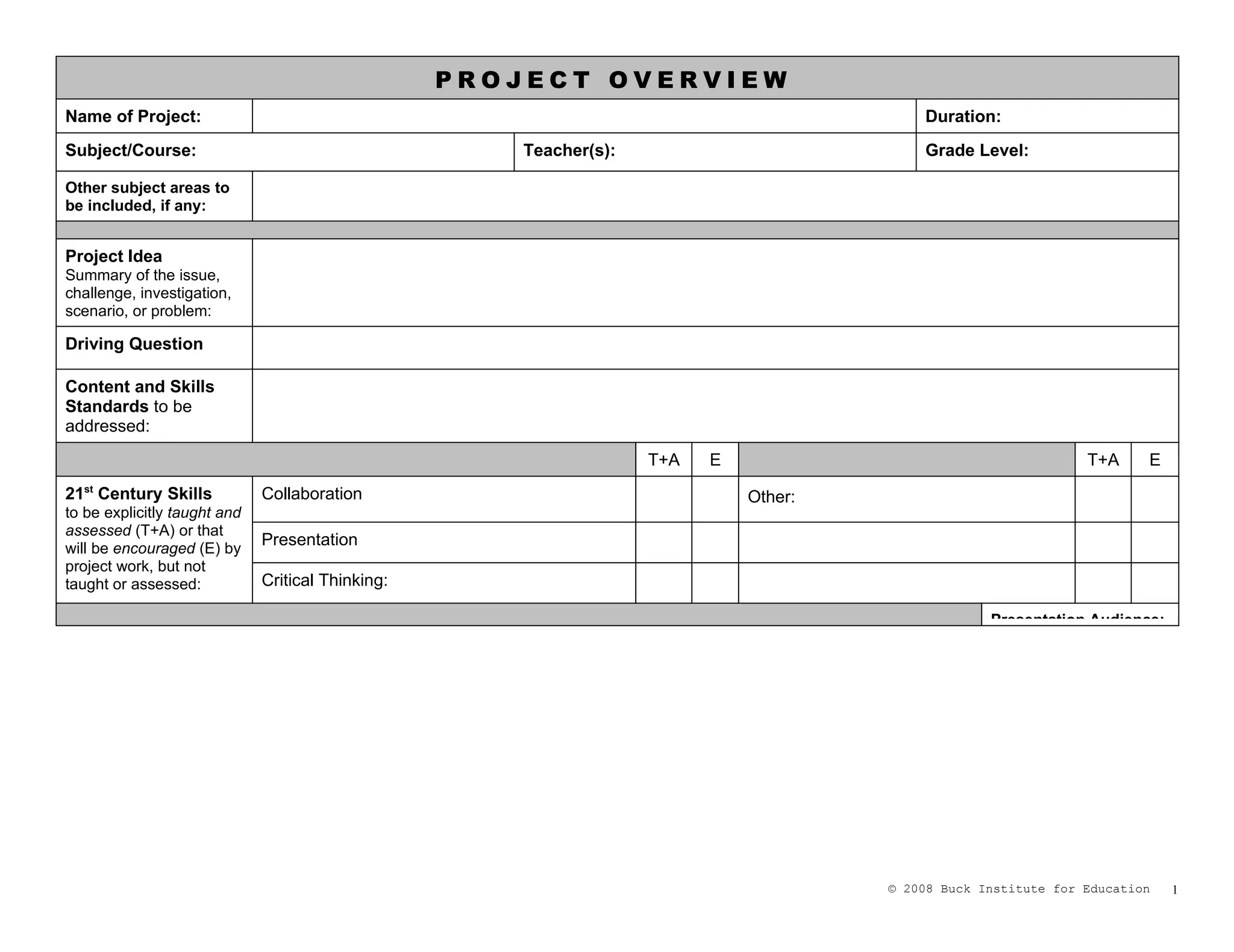 This document provides an overview for a project. It includes the name and duration of the project, subject areas covered, grade level, driving question, standards addressed, 21st century skills, culminating products, assessments, resources needed, and a guide for scaffolding lessons to support students. The overview lists collaboration, presentation, and critical thinking as skills to be taught and assessed through the project work. It outlines formative and summative assessments including tests, journals, presentations and products to be completed.