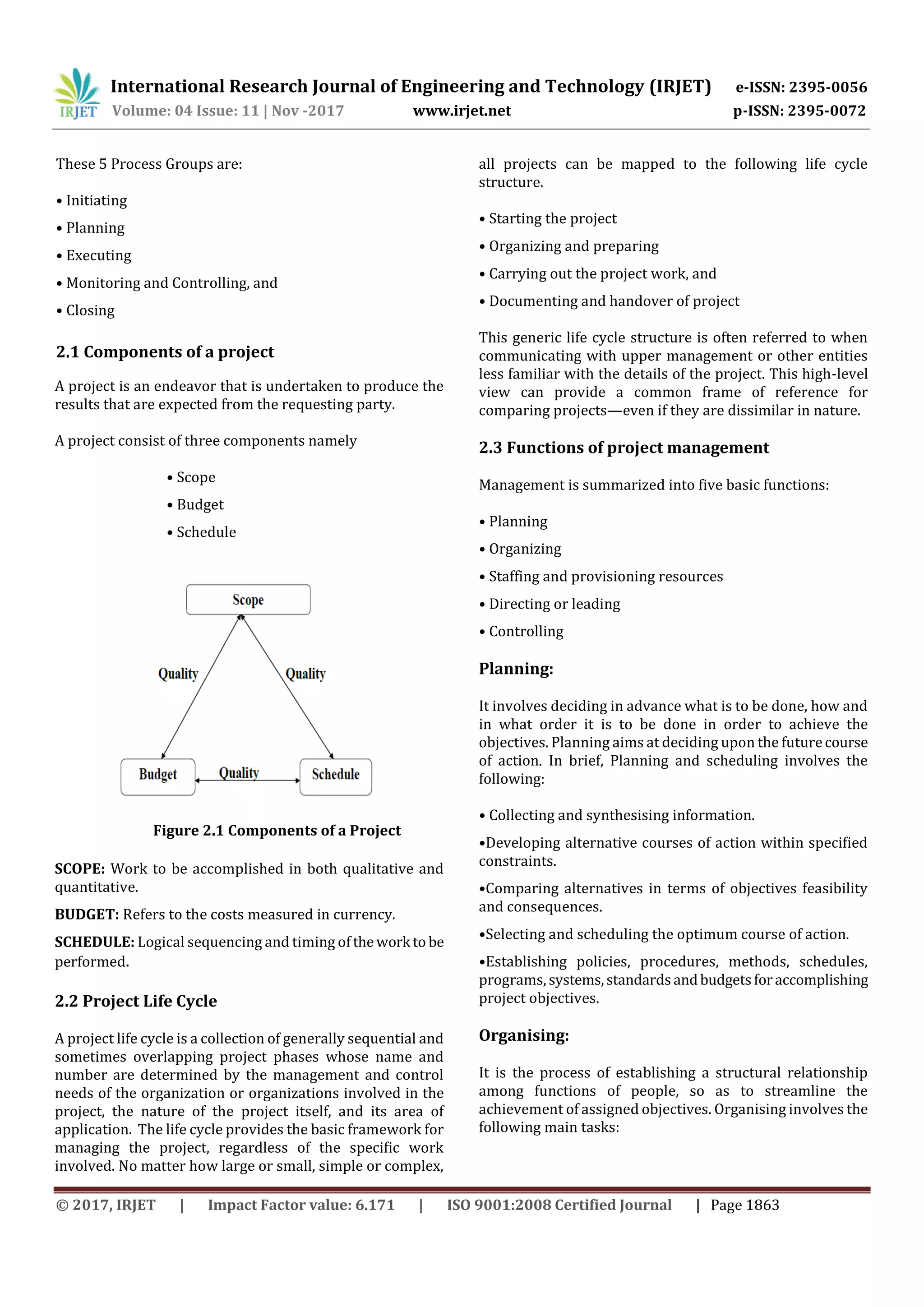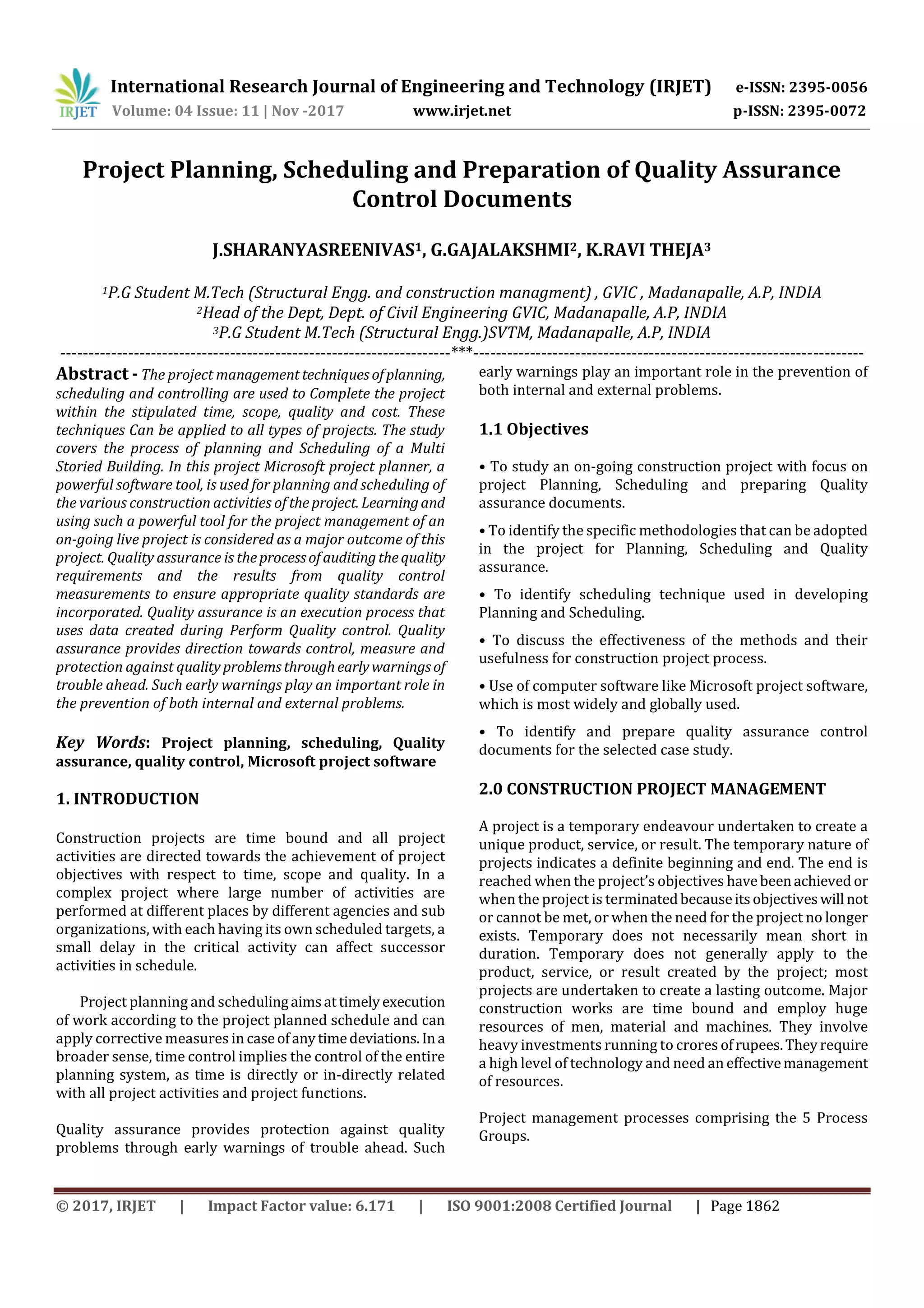 This document discusses project planning, scheduling, and quality assurance control documents for construction projects. It provides an overview of project management techniques for planning, scheduling, and controlling projects to be completed on time, scope, quality, and cost. It describes using Microsoft Project software to plan and schedule the construction activities of a multi-storied building project. It also discusses quality assurance and its role in auditing quality requirements and results from quality control measurements to ensure appropriate quality standards are met.