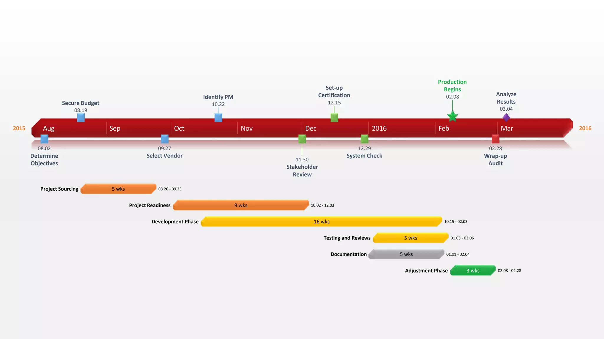 The document outlines a project timeline that spans from August 2015 to March 2016. It is divided into several phases including project sourcing, readiness, development, testing and reviews, documentation, and adjustment. Key milestones and dates are provided for securing the budget, identifying a project manager, setting up certification, production beginning, analyzing results, and wrapping up the audit.