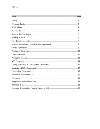 This document provides an overview of English Biscuit Manufacturers (PVT) Ltd (EBM), including its history, corporate profile, supply chain management, business processes, departments, biscuit production process, and types of biscuits produced. EBM has 14 production lines across two factories in Karachi and Hattar. Key departments include material management, finance, production, marketing and sales, and quality assurance. The production process involves mixing, cutting, baking, chilling, and packaging biscuits from raw materials.