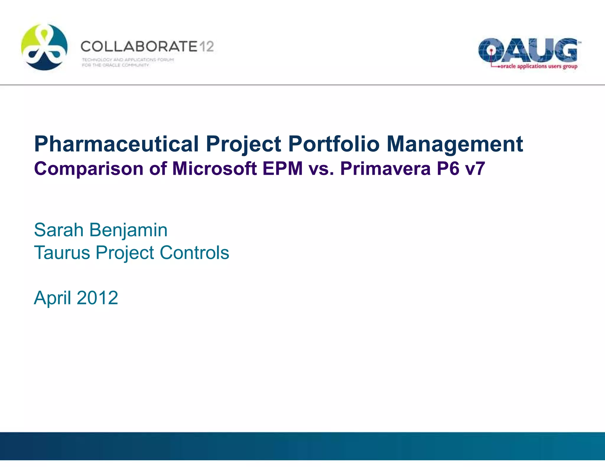 This document compares Oracle Primavera P6 and Microsoft EPM for project portfolio management software. It summarizes the experiences of two biotech companies, one using Primavera and one using EPM. Both systems provided schedule management and cost tracking. Primavera had advantages for customization and speed while EPM was easier to use but slower. Project prioritization was important, with both companies ranking projects based on business drivers, though Primavera calculated scores while EPM used pairwise comparisons. In conclusion, Primavera P6 is preferred for its robust capabilities over the less mature EPM, though company standards could favor Microsoft.