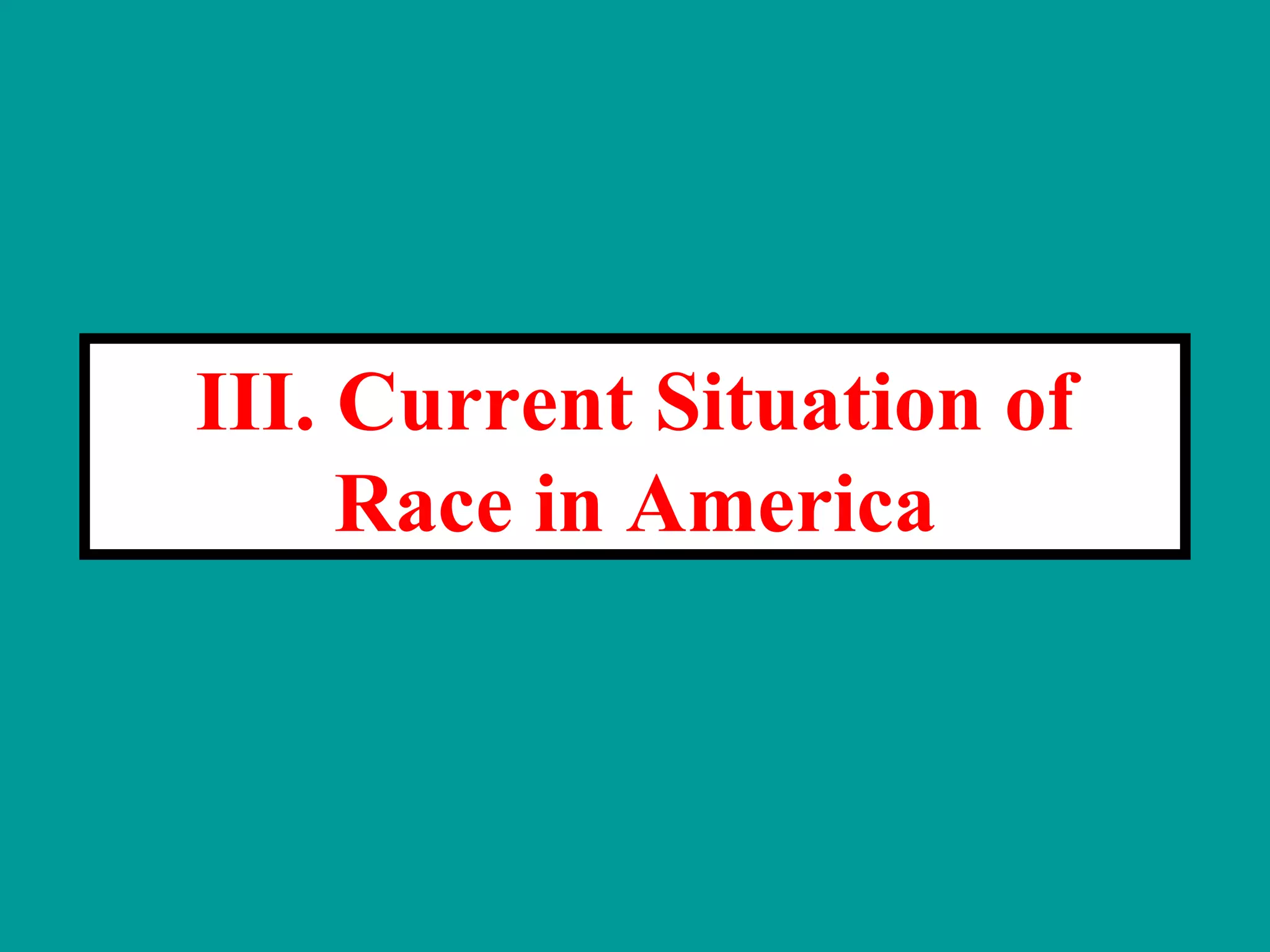 1. The document summarizes the current situation of race in America across several areas including education, employment, housing, criminal justice, and economic outcomes.
