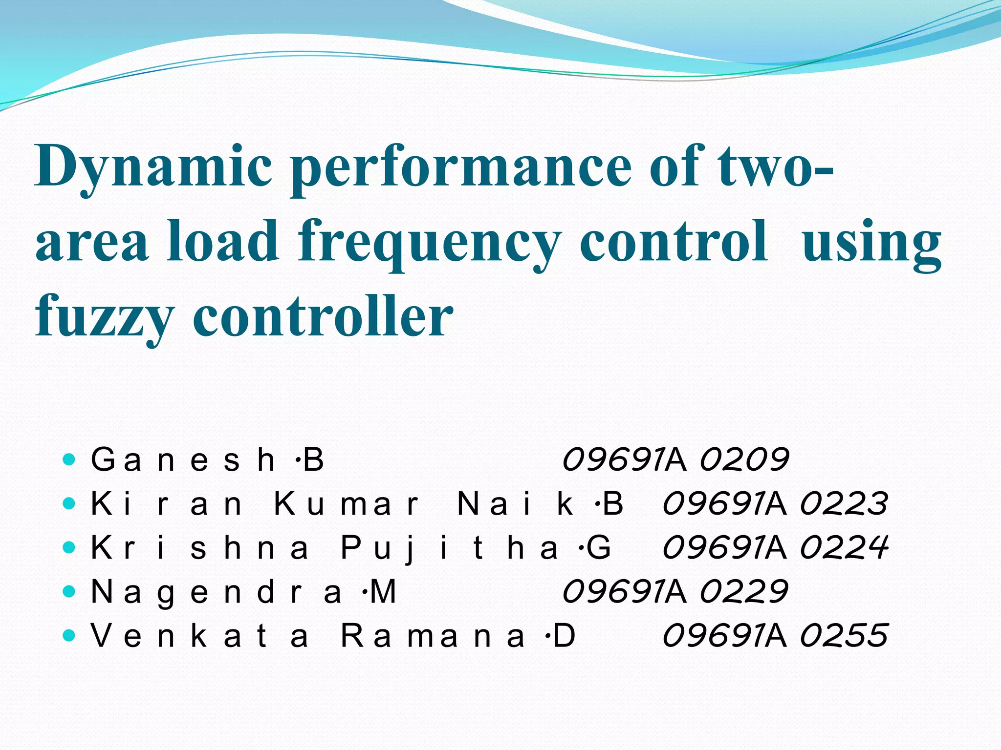 This document discusses a project to develop a Simulink model of a two-area load frequency control system using different controllers like PID, PI, fuzzy logic controller. The dynamic response of the two-area load frequency controller will be compared for different controllers. The objective is to control the frequency of an interconnected power system as the load varies which changes the speed and frequency of the generating unit. An appropriate controller must be designed to keep the system frequency within permissible limits.