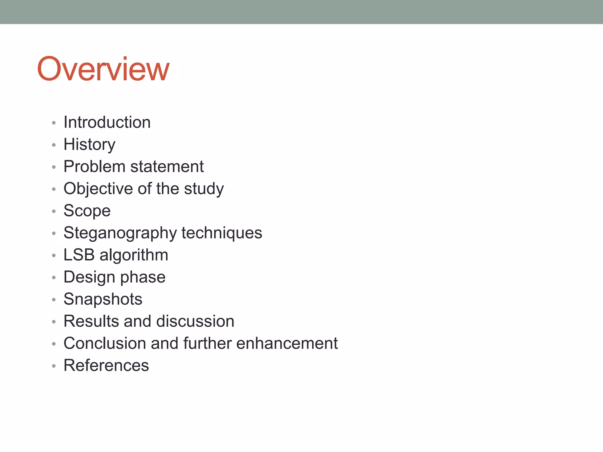 This document provides an overview of steganography. It discusses how steganography hides messages within carriers so that the message is concealed. The document then discusses the history of steganography dating back to ancient Greece. It also discusses modern uses of steganography during the Cold War and by terrorist groups. The document outlines the objectives of the study which are to provide security during message transmission. It then discusses steganography techniques like the LSB algorithm and provides snapshots of its implementation. Finally, it discusses the results of using LSB steganography and concludes with possibilities for further enhancement.