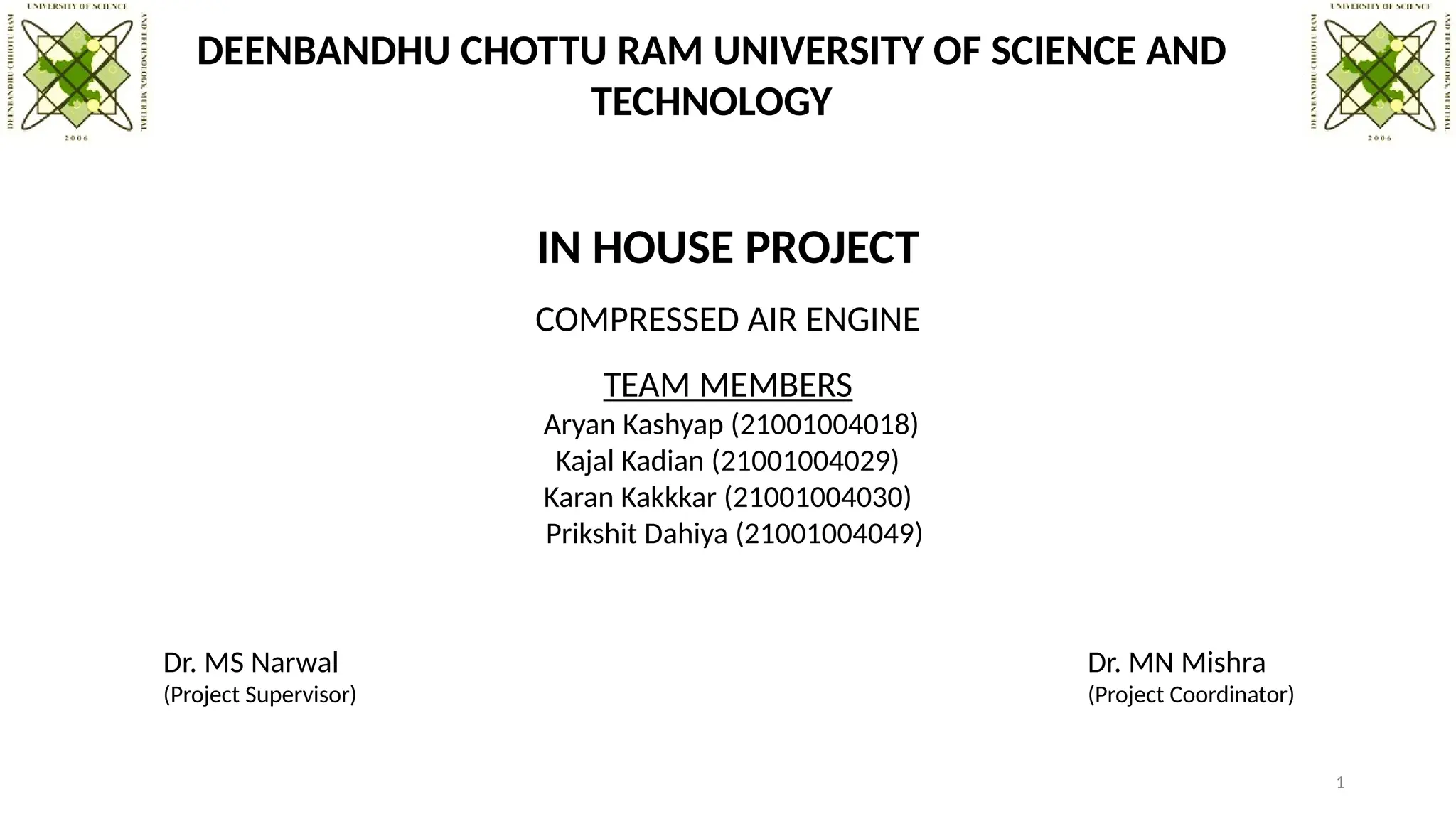 The document details a project on compressed air engines (CAEs) developed by a team at Deenbandhu Chottu Ram University, highlighting their environmental benefits, operational simplicity, and applications in various sectors. It outlines the motivation for using CAEs, including their zero emissions and potential for renewable energy integration, along with the components and functioning of the engine. The conclusion emphasizes the promise of CAEs in advancing sustainable energy solutions, while acknowledging existing challenges.