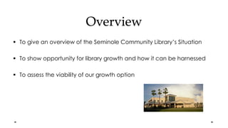 The document discusses opportunities for growth at the Seminole Community Library through increasing children's programming. It notes that peer libraries have higher percentages of residents with library cards than Seminole's current rate. The proposed approach is to give youth services full control over programming and make adult programs subordinate. This could increase attendance, new registrations, and publicity if implemented successfully. Potential risks include increased costs and staffing issues. In conclusion, children's programming represents an opportunity for library growth if properly supported and monitored.