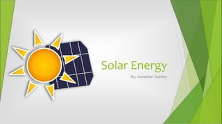 This document discusses solar energy, including what it is, how it works, applications, benefits, drawbacks, and recent advancements. Solar energy is a renewable form of energy generated from sunlight that is converted into electricity via solar panels. It can power homes, businesses and public infrastructure. While initial costs are high, it is clean and renewable. Recent research has aimed to improve efficiency and energy storage to help overcome drawbacks like reliance on weather and location.