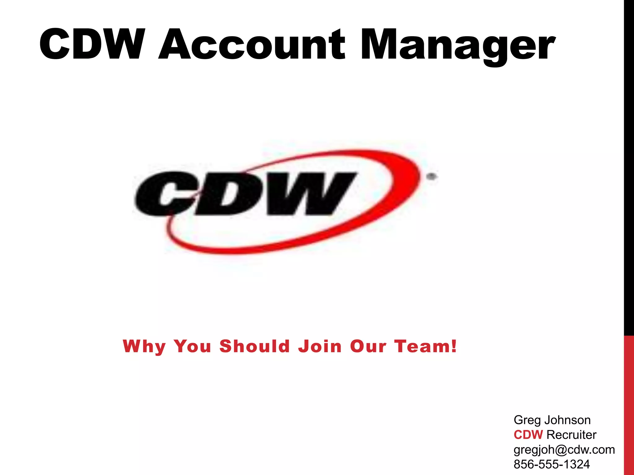 The document is a recruitment overview for CDW's Account Manager position by Greg Johnson, detailing the company's history and office locations. It highlights the benefits offered, such as health insurance, tuition reimbursement, and 401k plans, as well as the skills and responsibilities required for the role. Contact information for inquiries is also provided.