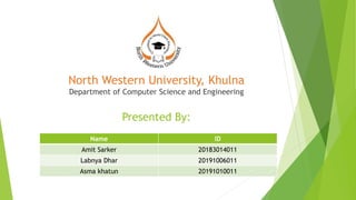 This document presents a project on a Questions Bank Management System (Qbank) developed by students at North Western University, Khulna. The system aims to help teachers avoid repetitive questions in exams by automatically selecting questions based on certain conditions. It allows teachers to create, store, and manage academic questions. The document outlines the objectives, methodology, proposed development model using HTML, CSS, JavaScript, PHP and MySQL. It includes use case and entity-relationship diagrams. Screenshots demonstrate the user interfaces for teacher and admin functions like adding courses, topics, questions, quizzes and viewing reports. It concludes that such a system can help digitalize the education sector in Bangladesh.