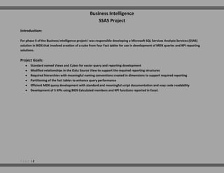 The document describes a project to develop an SSAS cube from four fact tables to support MDX queries and KPI reporting. It involved creating dimensions, hierarchies, and relationships in the data source view and cube. Sample MDX queries were developed utilizing measures, dimensions and hierarchies to retrieve and calculate data such as total costs, profits, and overhead by category and job.