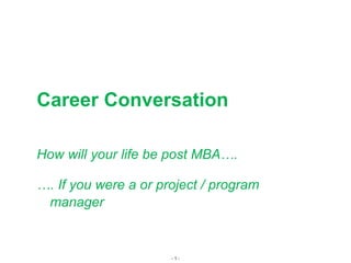 The document discusses project and program management. It defines a project as a temporary endeavor with a defined beginning and end, scope, timeline and cost. Project management involves managing a project team to achieve goals while managing these constraints. A program is a group of related projects that provide benefits when managed together. Program management focuses on aligning projects with organizational objectives. An MBA can help individuals in project management roles stay business focused, understand organizational dynamics, and leverage tools from other business disciplines like strategy and operations.